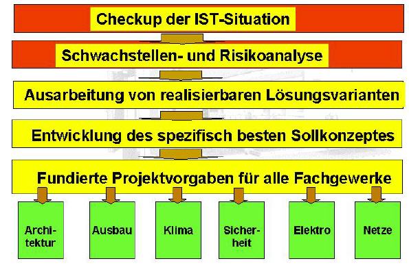 Durch unsere hohe gewerkeübergreifende Fachkompetenz und unsere spezifischen IT-Kenntnisse erhalten unsere Kunden optimale Lösungskonzepte unter Einbeziehung aller relevanten betrieblichen Anforderungen.