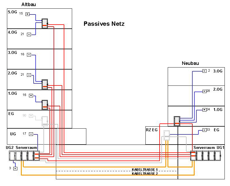 Ein zukunftsweisendes Verkabelungsnetz muss umfassend die Normierungen gemäß DIN 50173 und DIN 50174 erfüllen. Nur wenn diese Standards fachplanerisch erfüllt werden, ist ein optimaler Investitionsschutz gewährleistet. Wichtige Voraussetzungen für ein kostengünstiges und betriebstechnisch zweckmäßiges Verkabelungsdesign sind langjährige Projekterfahrungen im Bereich "Passive Netzwerktechnik".